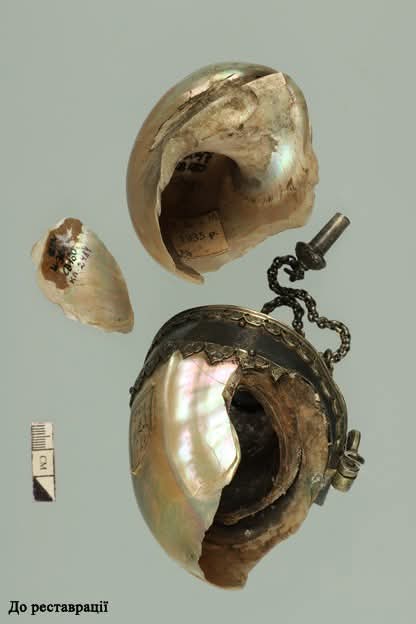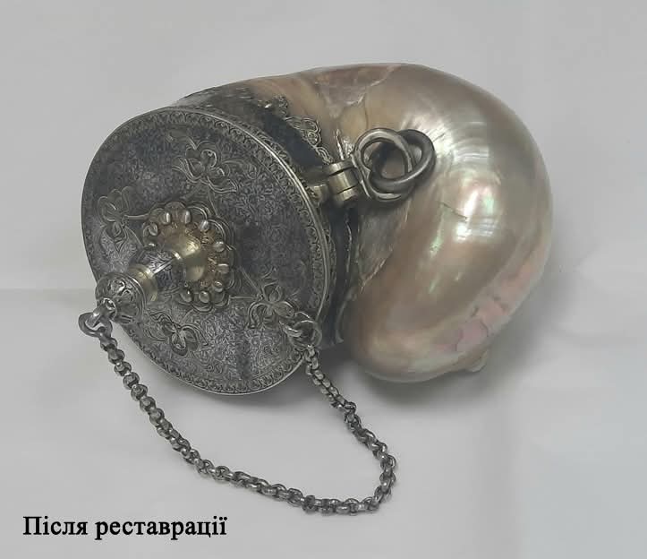 Срібна ювелірна оправа прикрашена карбованим рослинно-геометричним та сітчастим рослинним орнаментом, виконаним у техніках чорніння, карбування, золочення. Завершенням оправи є носик та фігурна пробка, яка кріпилась металевим ланцюжком. При надходженні натруска перебувала в незадовільному стані, мушля була розбита на частини, з яких збереглося три, решта – утрачено.