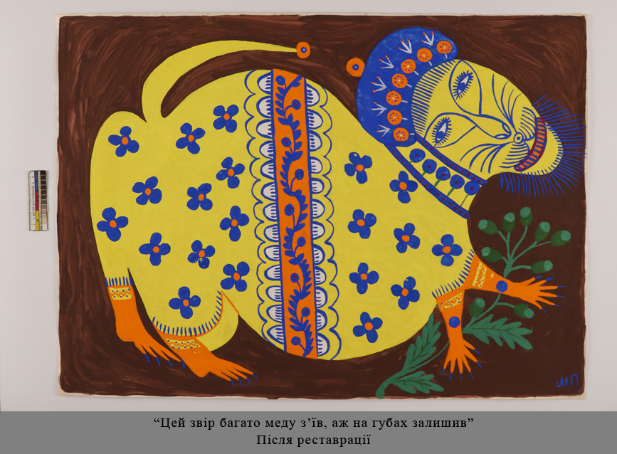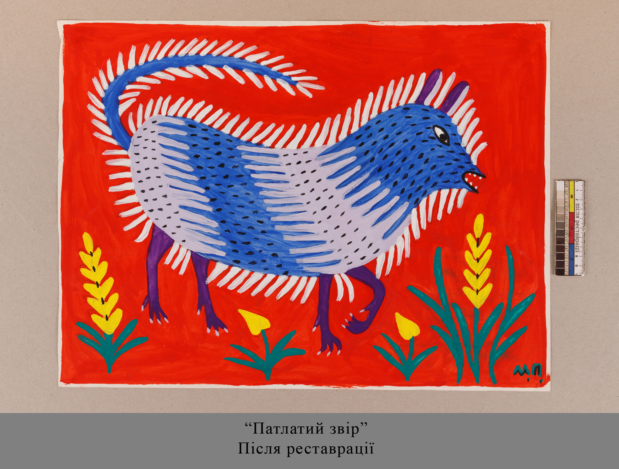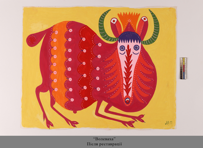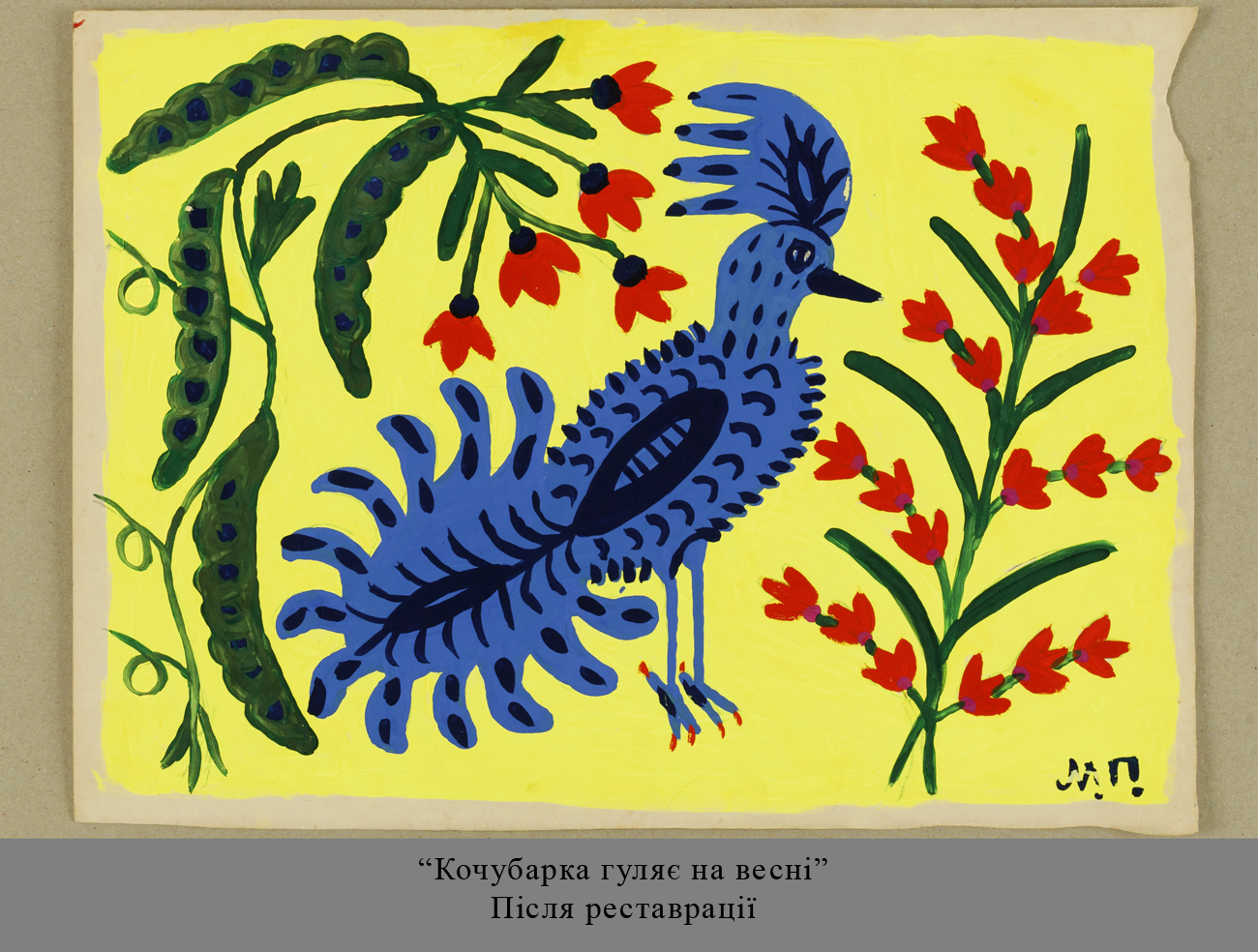 Національний науково-дослідний реставраційний центр України завершив реставрацію дев’яти творів видатної представниці українського наївного мистецтва – Марії Примаченко. Роботи надійшли з Національного музею народної архітектури і побуту. Численні забрудення, залами, дрібні розриви, втрати фарбового шару та основи, а також її деформації завадили експонуванню творів. Відповідні реставраційні заходи, включно з тонуванням і вирівнювнням, проводились художниками-реставраторами графічних творів вищої категорії, зокрема: Гайчук Тамарою, Орєховою Настею, Яценко Ганною, Яценко Світланою і художником-реставратором першої категорії – Осадчею Євгенією. Серед творів, що готові повернутись в стіни музею, були «Патлатий звір», «Дикий горботрус», «Калина цвіте…» та багато інших.