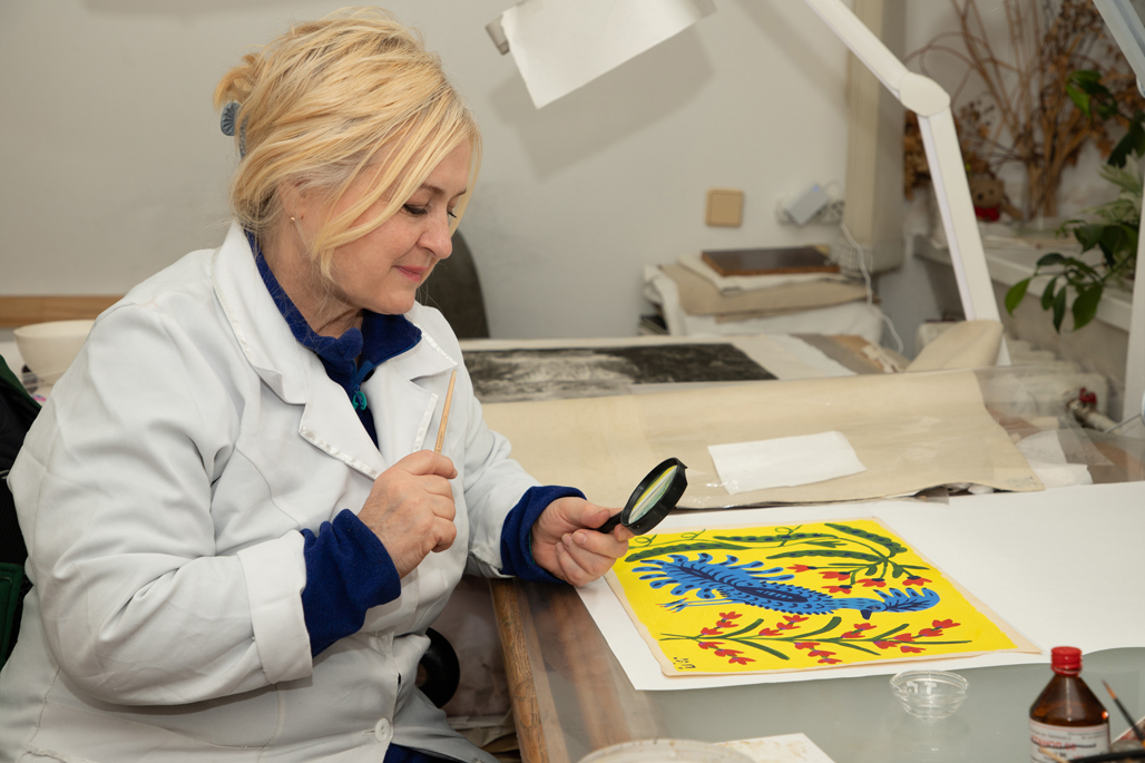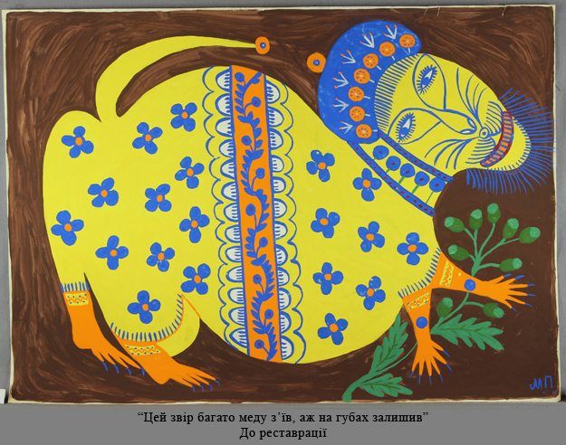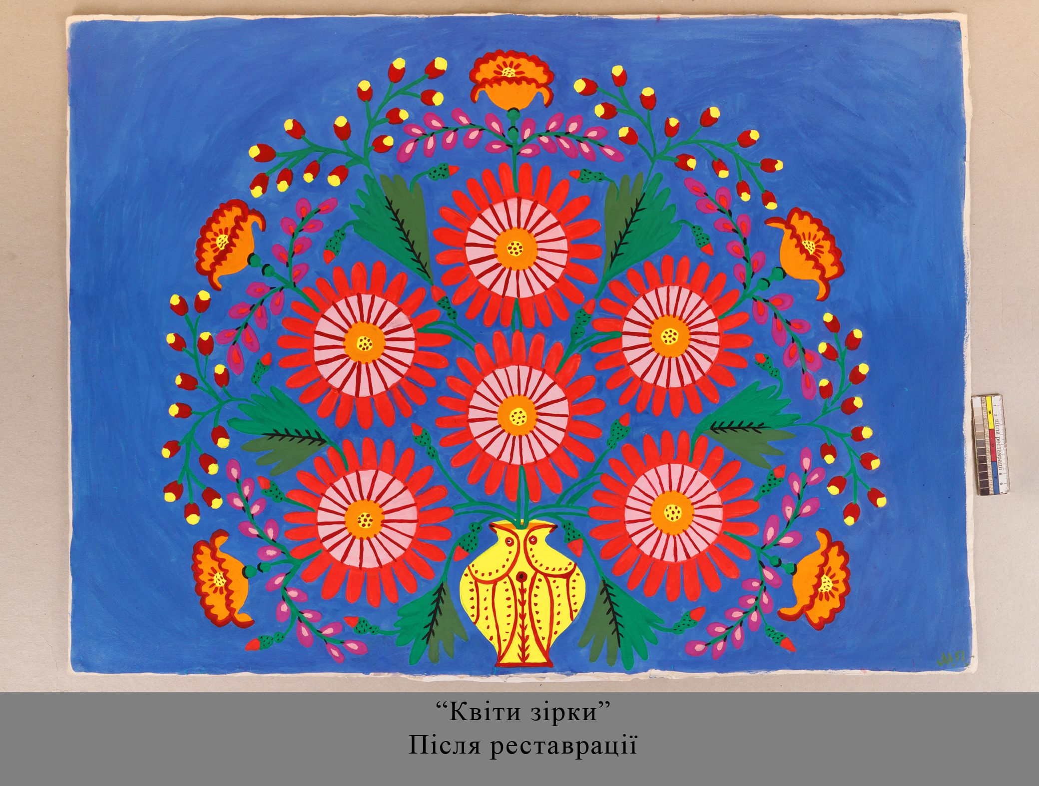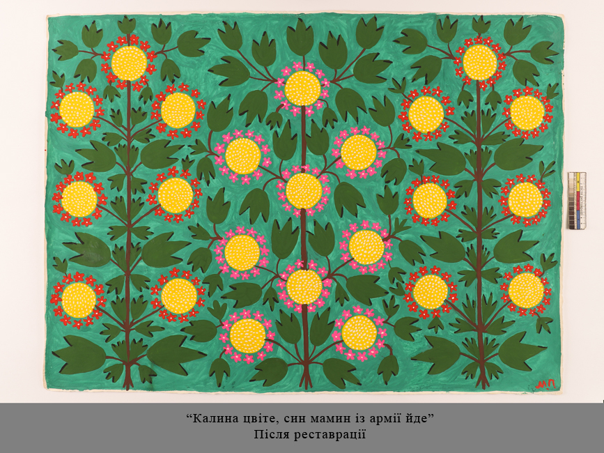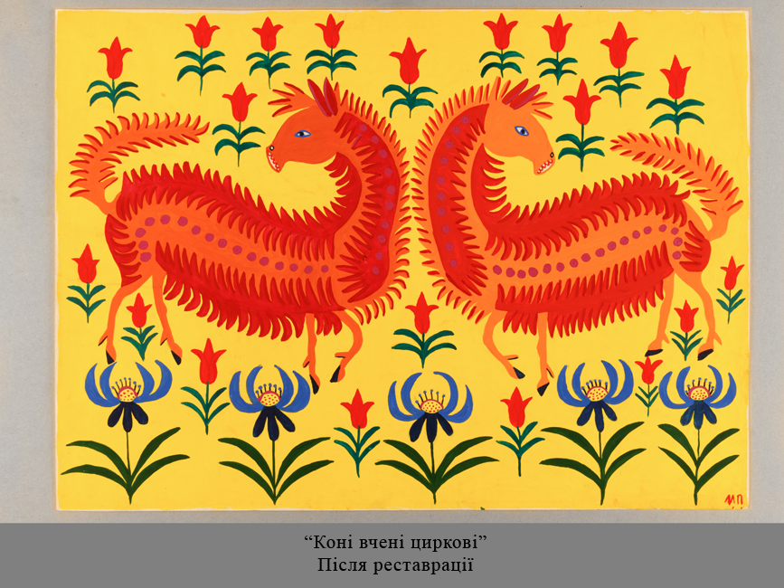 Національний науково-дослідний реставраційний центр України завершив реставрацію дев’яти творів видатної представниці українського наївного мистецтва – Марії Примаченко. Роботи надійшли з Національного музею народної архітектури і побуту. Численні забрудення, залами, дрібні розриви, втрати фарбового шару та основи, а також її деформації завадили експонуванню творів. Відповідні реставраційні заходи, включно з тонуванням і вирівнювнням, проводились художниками-реставраторами графічних творів вищої категорії, зокрема: Гайчук Тамарою, Орєховою Настею, Яценко Ганною, Яценко Світланою і художником-реставратором першої категорії – Осадчею Євгенією. Серед творів, що готові повернутись в стіни музею, були «Патлатий звір», «Дикий горботрус», «Калина цвіте…» та багато інших.