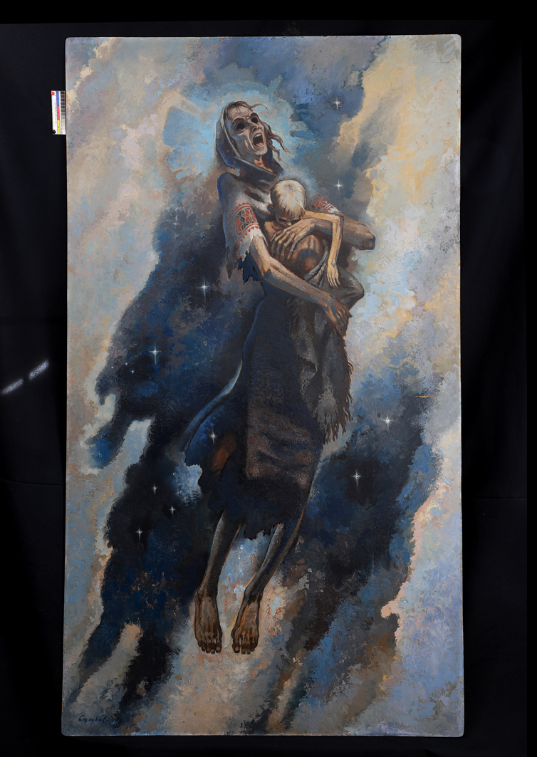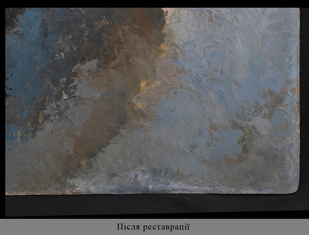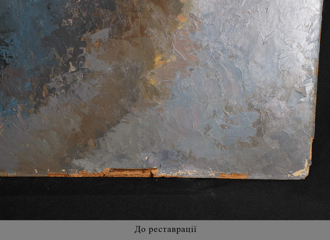 Твір надійшов до музею у незадовільному стані і тому потрапив в турботливі руки фахівців Реставраційного Центру. Основа – суцільна деревинноволокниста плита, яка була значно пошкоджена по периметру. Зокрема, наявні відлущування, розшарування, потертості з лицевого боку, а зі звороту – замокання і деформація з вигином. Постраждав також і живописний шар, адже внаслідок механічних втручань з’явились відшарування його від ґрунту. Окрім самого твору до ННДРЦУ передана ще й авторська рама, яка також потребувала реставраційних втручань через втрачену коструктивну цілісність. Досить символічно, що художник-реставратор Анастасія Стрельцова розпочала роботу над твором під час активної фази збройної агресії у 2022 році. І хоч робота була надважкою через складні умови праці, надмірну завантаженість у зв’язку із залученістю реставратора до порятунку культурних цінностей в музеях України і через потребу в дослідженні техніки автора, у 2023 році реставрація була завершена. За задумом автора картина має мати надзвичайний вплив на емоційний стан глядача, що вдалося зберегти завдяки майстерності пані Анастасії.