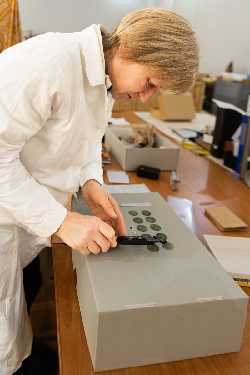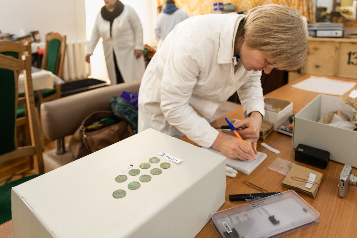Першим етапом роботи став візит до Вінницький обласний краєзнавчий музей. 16 грудня художник-реставратор вищої категорії науково-дослідного відділу реставрації творів з металу Олександра Головченко провела обстеження стану збереженості речового комплексу, що складався з двох скроневих підвісок та 58 монет з унікального археологічного скарбу XIV–XV ст., виявленого поблизу Вінниці влітку 2025 року.