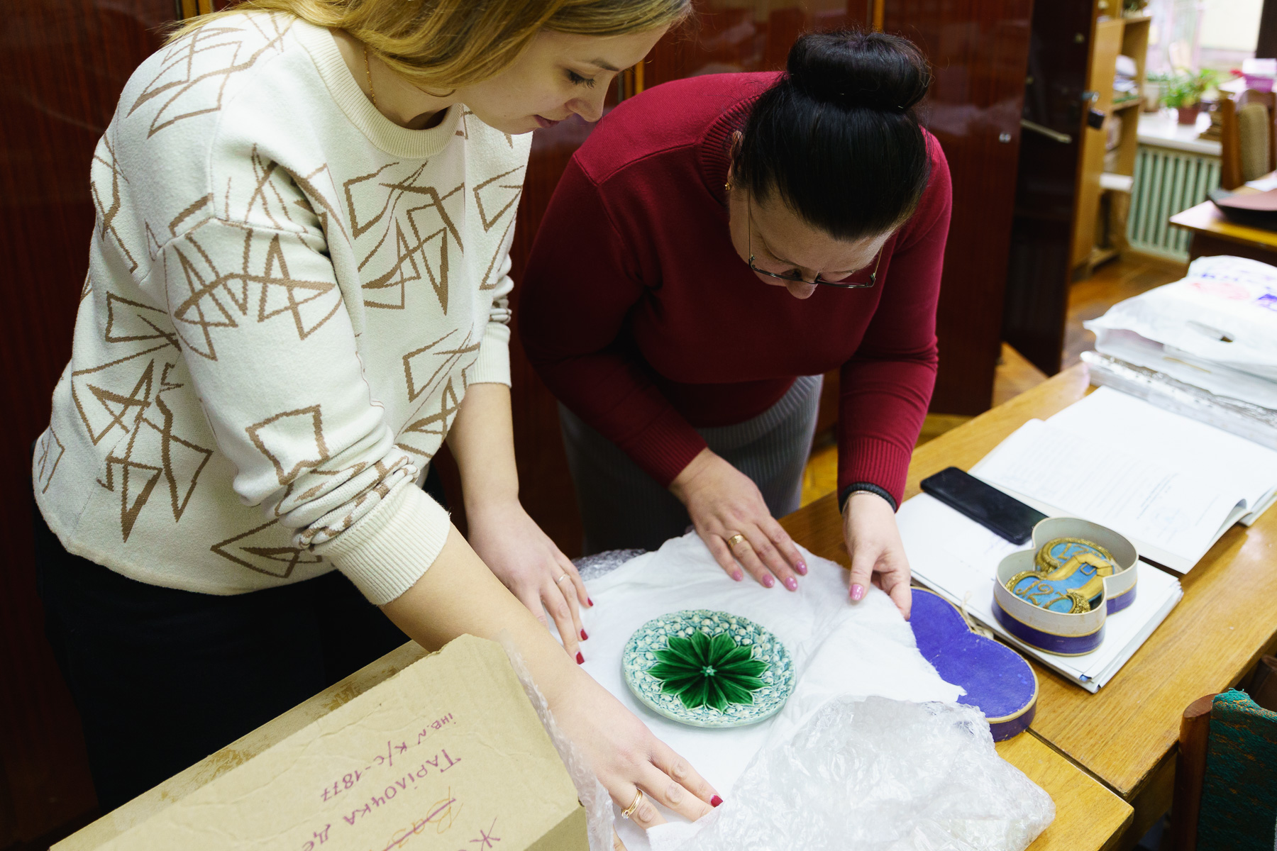 Наступним етапом відрядження став візит до Житомирський обласний краєзнавчий музей, куди фахівці передали предмети, над якими завершено реставраційні роботи, зокрема сувої та керамічну тарілку. Спільна робота з музеєм триватиме, оскільки значна частина фондів потребує планового обстеження та консерваційно-реставраційних заходів для їхнього збереження в умовах воєнного стану.